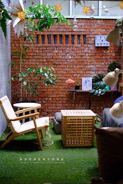 青田甜作內最熱門的座位區即是後方的紅磚區,底部是透明的,當陽光灑落整個空間也變得明亮。紅色磚牆搭配綠色人造草皮,也讓整個空間色彩鮮明。